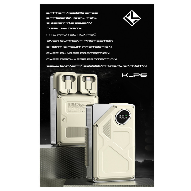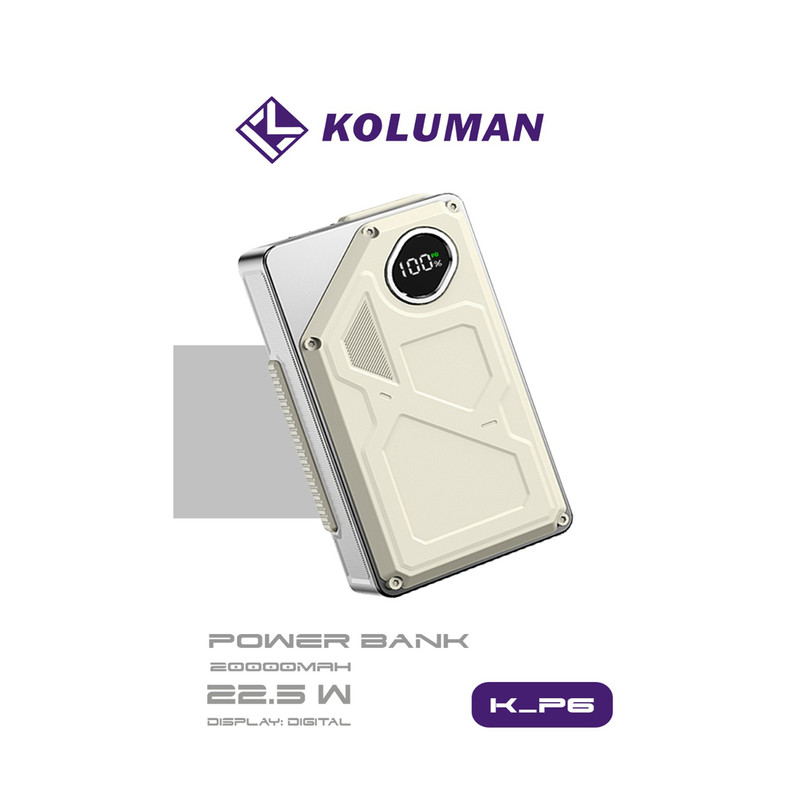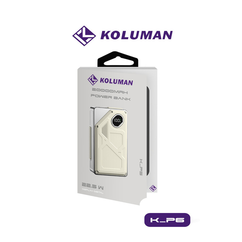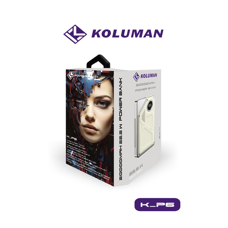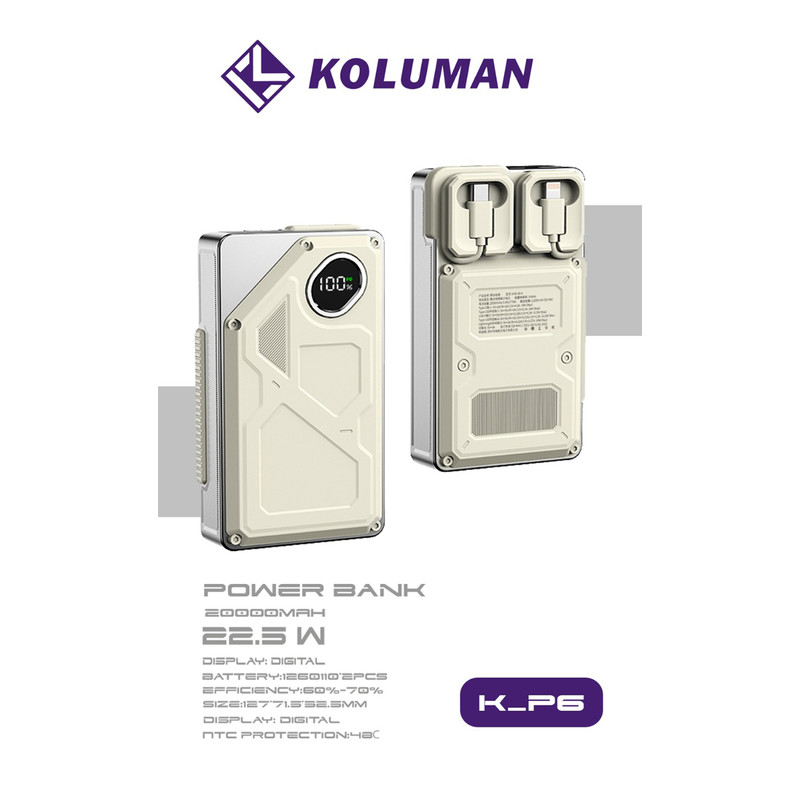 پاور بانک کلومن مدل K_P6 با ظرفیت واقعی 20000 میلی آمپر ساعت با طراحی مدرن و زیبا دارای نمایشگر دیجیتال LED جهت نشان داد درصد شارژ دارای 2 کابل خروجی متصل به بدنه تایپ C و لایتنینگ و ورودی USB و تایپ C و پشتیبانی از شارژ سریع fast charging و دارای توان خروجی 22.5 وات میباشد.ویژگیها : 1-محافظت در برابر ولتاژ و جریان و جریان بیش از حد و اتصال کوتاه و شارژ بیش از اندازه 2-طراحی مقاوم با قاب نسبتا ضخیم و بدنه شبیه فلزی از جنس پلاستیک سخت 3-وزن نسبتا زیاد حدود 400 گرم بخاطر ظرفیت بالا همچنین این مدل بیشتر برای کاربرهایی طراحی شده که میخواهند همزمان چند دستگاه را شارژ نمایند.